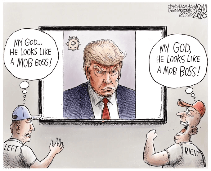 Telnaes and Zyglis indulge in a bit of asked-and-answered dialogue here: Telnaes fills in the mugshot to suggest a mob boss, while Zyglis notes that, as horrifying as that may be to half the nation, there is another half who see the comparison as exciting and heroic.