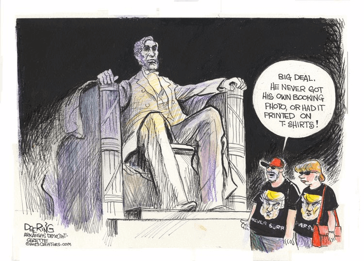 By contrast, as Ella Baron points out, Donald Trump sits in the presidential seat, and his (allegedly) criminal behavior pushes Lincoln out of a once-noble roost in the pantheon of Great World Leaders. It’s a painful comparison made worse by her being British, which adds the embarrassing “The Whole World is Watching” element.