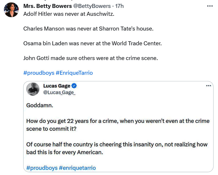 Not everyone is cheering this example of the majesty of the law, as one would expect in the midst of a centerless civil war, but Mrs. Betty Bowers had a pretty good answer for one of the rebs who protested Tarrio being sentenced without having been at the scene of the attempted coup: