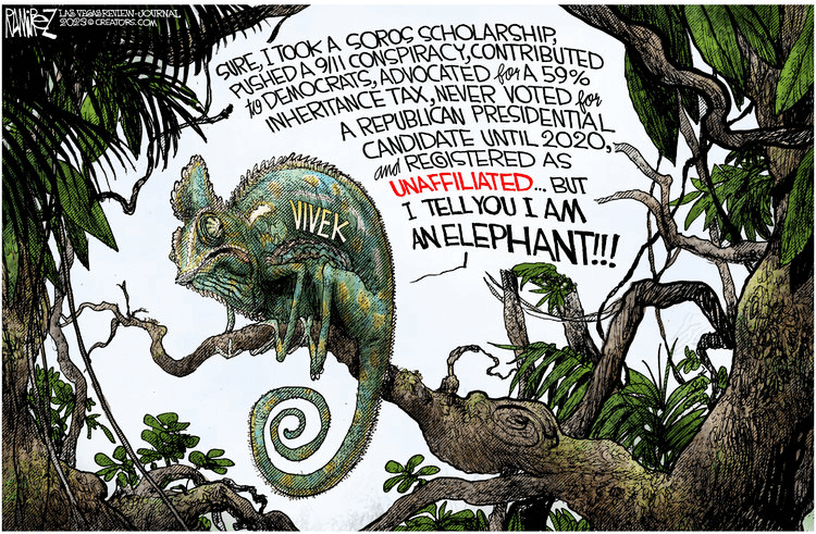 He’s built solid name recognition in New Hampshire and, while nobody seems to be able to touch Trump’s lead in the polls, Ramaswamy is doing about as well as anyone and better than several, despite, as Ramirez notes, his transparently fake pretense of even having beliefs, much less any genuine, workable policies.