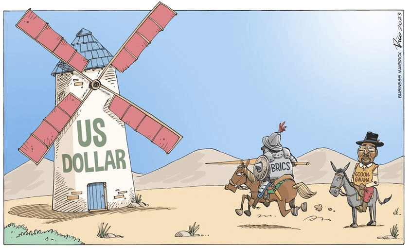 There’s been scant coverage by American news of the formation of BRICS, an alliance of non-Western nations which hopes to counter the dominance of the American and European economies, a task Rico Schacherl, cartooning for South Africa’s Maverick business pages, suggests is, well, quixotic.