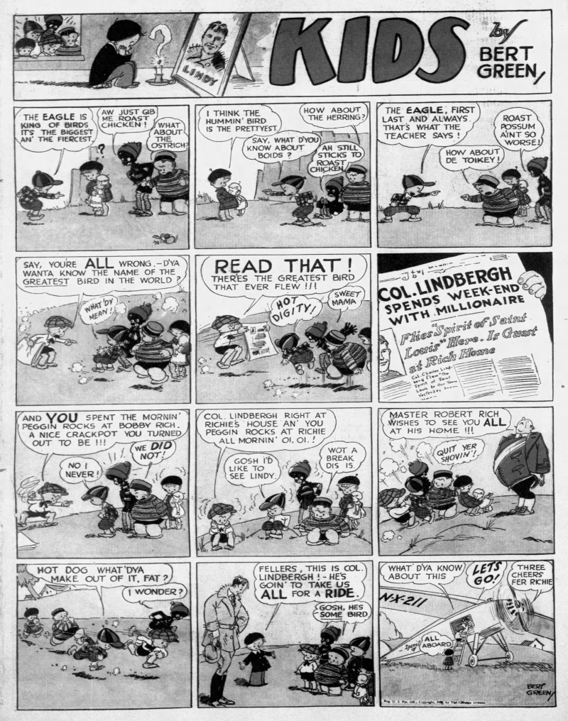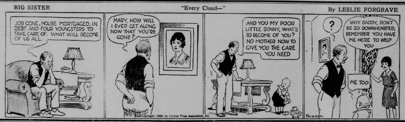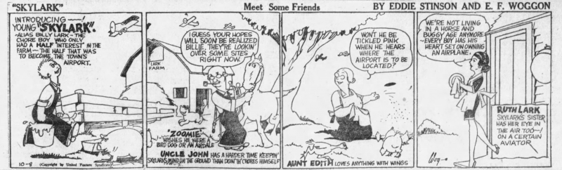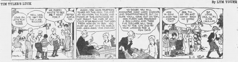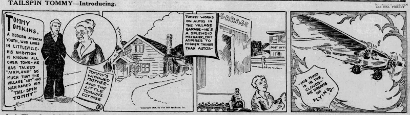Perhaps the most famous would be Tailspin Tommy by Glenn Chaffin and Hal Forrest, the first strip to exploit the worship of Charles Lindbergh and the aviation craze. Tim Tyler’s Luck by Lyman Young also debuted in 1928. It ran far longer than it should have probably due to the syndicate efforts to play up to Lyman’s brother Chic (Blondie) Young.