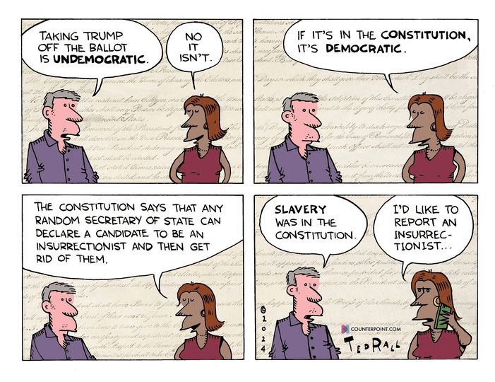 And then Ted Rall (Counterpoint) steps in to demonstrate that no statement is so utterly foolish that it can’t be topped. Perhaps Trump was asleep in class when they taught all the arguments and compromises that attempted to resolve the slavery issue before it burst into open warfare.