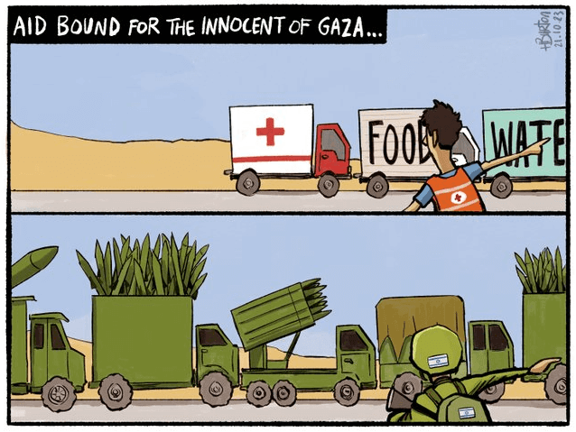 What the public sees, as Harry Burton points out, is the contrast between rushing aid to Gaza and rushing bombs and rockets to them.