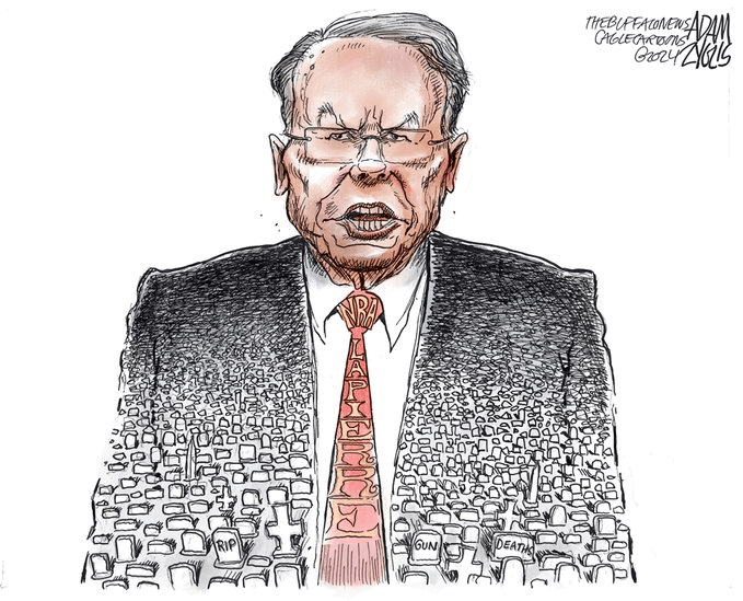 YMMV, but I’m giving the salute to Zyglis because while Wuerker catalogs the variety of deaths, I like Zyglis’s verbal economy in not doing more than using the tie to label the subject of his cartoon, and his making the deaths an integral part of LaPierre and his legacy.