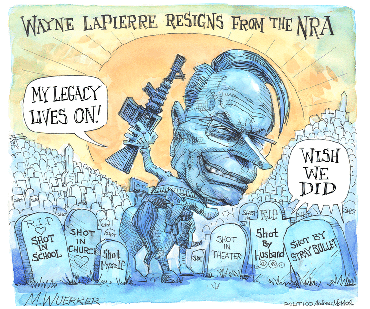 I’ve seen other cartoons about retiring NRA executive Wayne LaPierre with blood on his hands, but I was particularly struck by this Juxtaposition, in which both cartoonists show him with the tombstones of victims of guns.