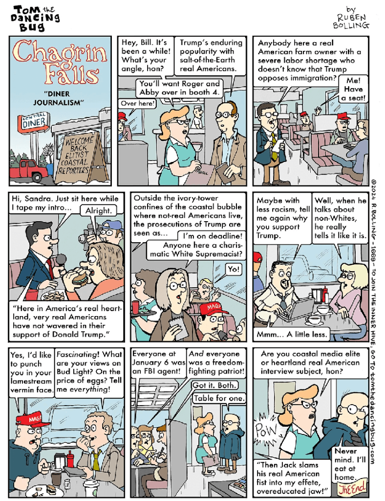 Tom the Dancing Bug proves that accurate reporting can be the sharpest form of satire, because he needs only to adjust the dialogue slightly to sum up the journalistic combination of laziness and looking for a predetermined story with which we live every four years.