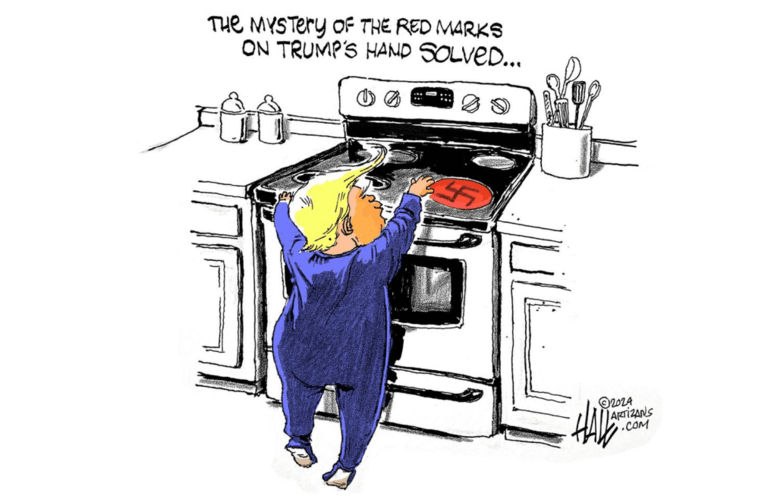 Ed Hall, by contrast, uses humor in repeating the trope of the Toddler-in-Chief, whose damaged hands, he suggests, might have come from his getting burned while reaching for Nazis. It is sarcasm; nobody excuses Trump’s excesses on the basis of naivete, despite how he pretends innocence, as seen in this