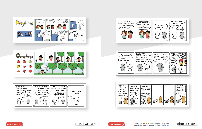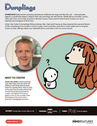 Dumplings by Victor Van Acker first appeared on Comics Kingdom last Summer. The King Features (KFS) press kit says the comic strip is now/will be available to hard copy newspapers daily and Sunday.