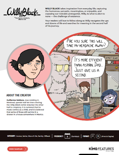 Simultaneously with the Dumplings release King Features again by way of a digital press kit announced the availability of a Sunday only Willy Black by Guillermo Saldaña for print publications. The Willy Black comic strip first appeared on Comics Kingdom a year ago. The press kit’s description of Willy Black: