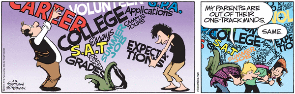 Zits (KFS) makes me grateful to have gone to college in simpler times, when costs were more in line with what people could afford and there wasn’t anywhere near the emphasis on self-packaging. You just took the SATs and ACTs and tried to get good grades.