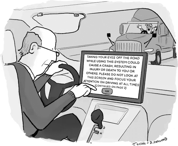 I recently had a loaner for 48 hours with a giant screen on the dashboard and I’m only alive today because I couldn’t figure out how to turn the thing on. Reminds me of a press release the Maine State Police sent my paper about a woman stopped for speeding and then ticketed again for having a laptop on the passenger seat showing an episode of the Gilmore Girls.