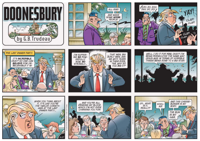 However, in the April 7 Doonesbury strip, in which Trudeau equates Trump to Jesus Christ, Trudeau has crossed the line. The strip is titled “The last dinner party.” This is an offense – an outrage – to all Catholics and Christians.