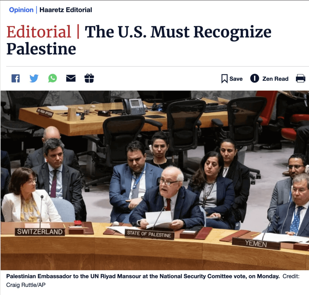 and a major newspaper in Israel, Ha-aretz (paywall), ran an editorial calling on the US to recognize Palestine.