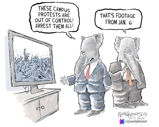 A couple of odd spots, in fact. They continue to defend the so-called “hostages” of January 6, who were far more disruptive and destructive than the kids sitting on the grass at colleges, but, while ignoring the assaults on police by those “peaceful tourists,” they’re also intent on firing college presidents for not siccing the local cops on their kids.