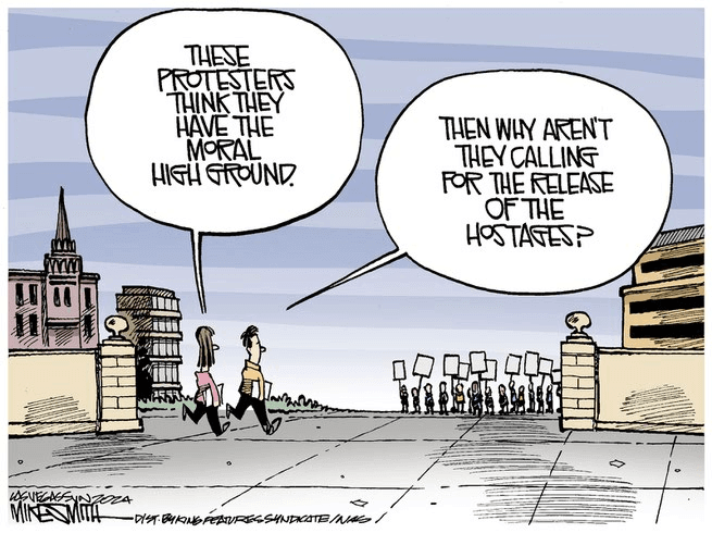 Smith’s accusation is a little tougher, though it sure feels like both-sidesing the issue. It would be nice if the kids were chanting “Stop the Bombing! Free the Hostages!” but that’s not how movements work.