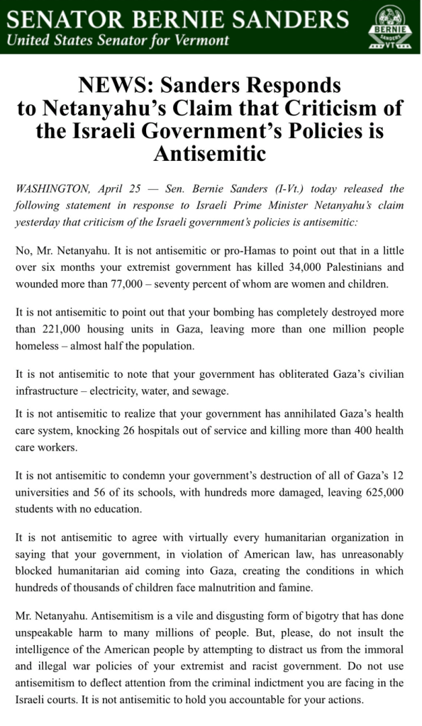 Bernie Sanders issued an open letter to Netanyahu insisting that opposition to government policy is not antisemitic,