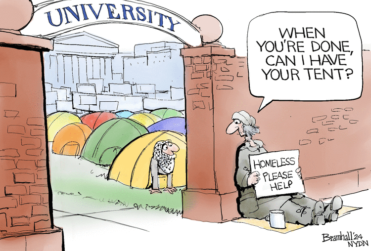 Bramhall is correct that the homeless problem matters, though sleeping under a bridge in NYC seems better than being buried in bombed-out rubble in Gaza. Still, I’d like to have someone grab a clipboard and walk through the demonstrators, polling them to see how many have also worked to aid the homeless.