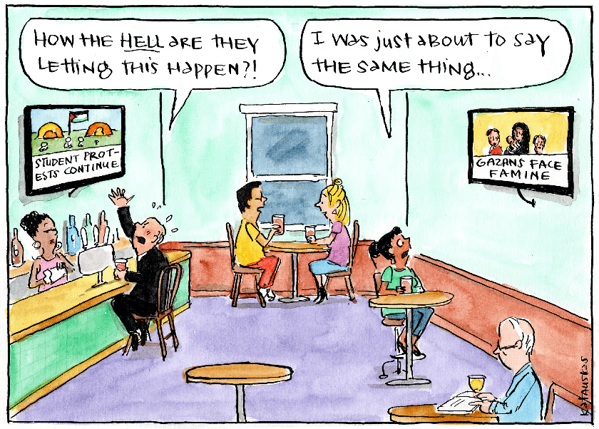 I gather the folks who opposed demonstrations then are, like the fellow in Katauskas’s cartoon, angry to see that the young people who can’t look away in silence are back in the streets.