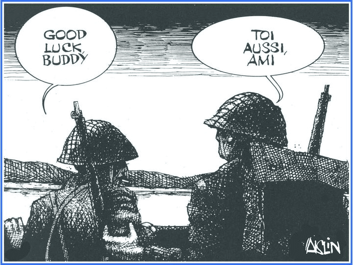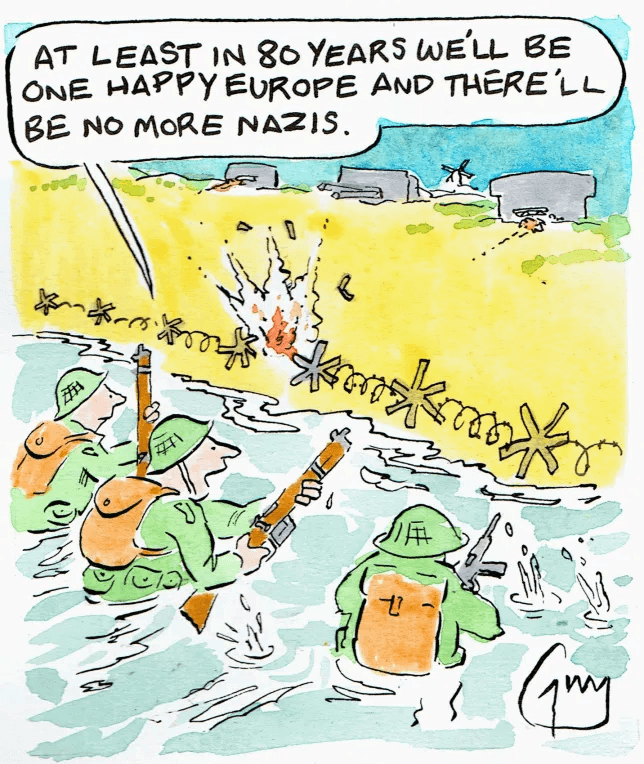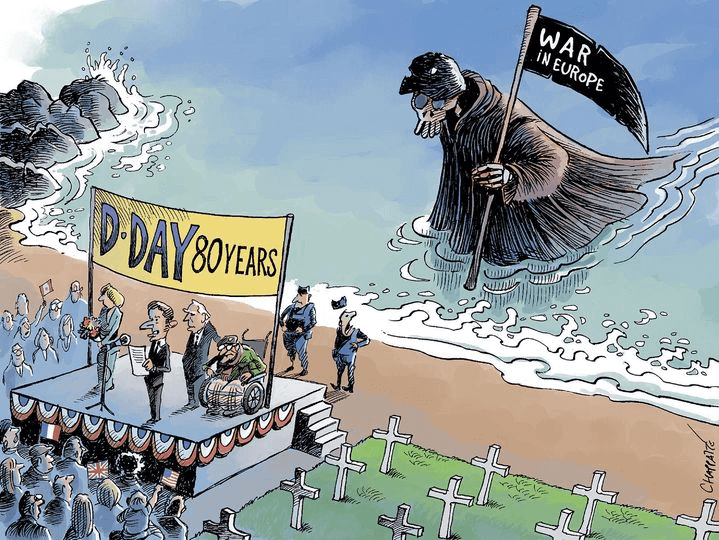 Aislin starts off our D-Day commemoration in part because the Canadians tend to get bunched in with the British forces in other commentaries I’ve seen, but mostly because he marks the day by remembering strong, young men while most others are depicting old guys in wheelchairs, sometimes saluting.