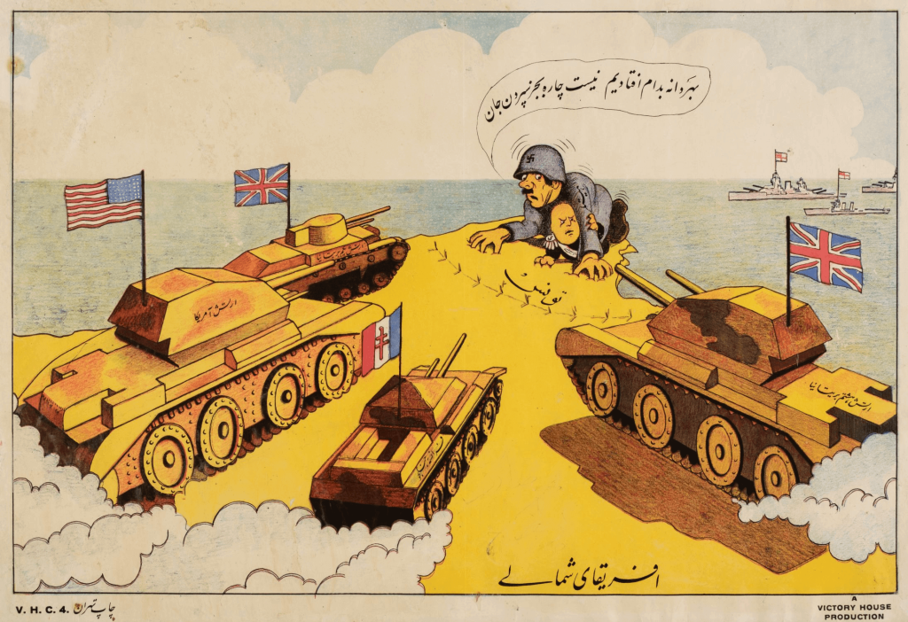 A factor that often gets lost in our second-hand remembrance of the war is that while D-Day was the largest assault upon the Axis’s European holdings, they’d already suffered a major defeat in North Africa, as seen in this Farsi cartoon.