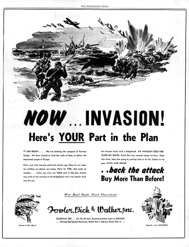 But while the invasion itself was top secret, the fact that it was coming was clear enough that, by June 7, local companies had full-page ads celebrating the event and reminding people to buy War Bonds. I’m sure that people in Binghamton knew Fowler, Dick & Walker, but note that the store makes very little pitch for itself beyond a note pointing out that they have a bond sales booth on the main floor.