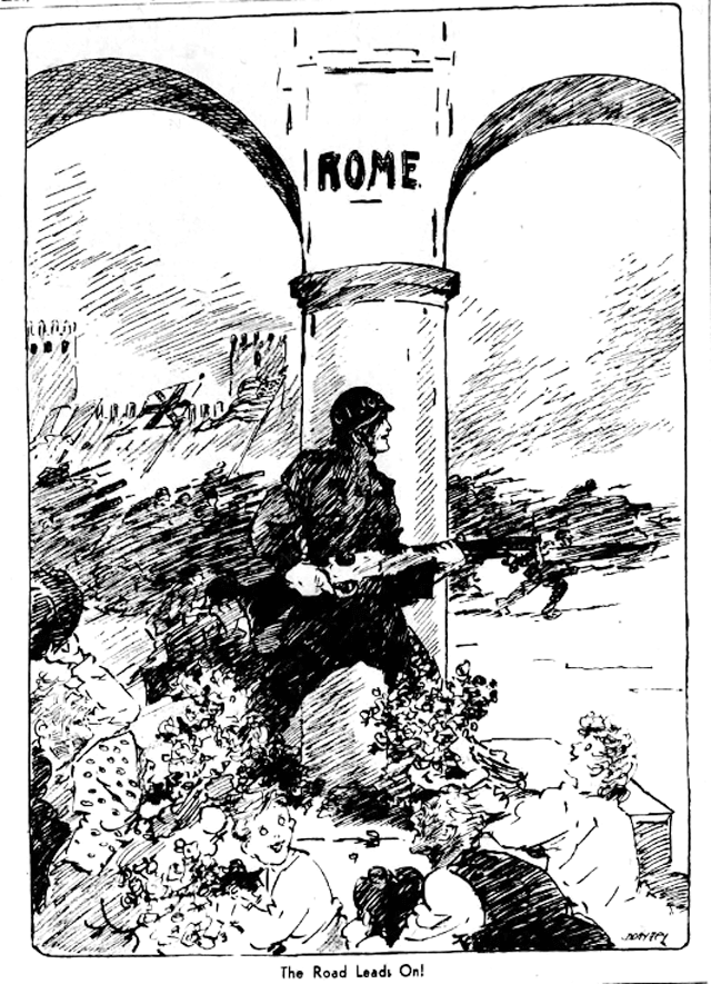 As James Harrison (Hal) Donahey recorded in the Cleveland Plain Dealer, Rome fell to the Allies two days before D-Day. It wasn’t the end of the war in Italy, but it followed a very tough campaign, commemorated in Catch-22 and cartooned at the time by Bill Mauldin.