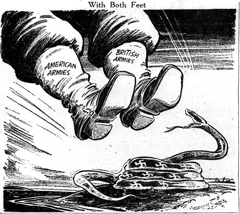 I was surprised to see so many cartoons referencing D-Day on June 6, 1944 itself, including this Dorman Smith piece. It’s important to remember that we had a great many more afternoon papers then, which gave time for more in-depth coverage, though the time difference with France meant that even the morning papers had the story.