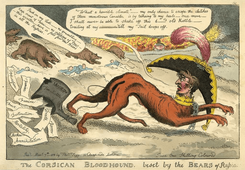 Which causes me to switch wars and feature this Thomas Tegg cartoon, drawn after the outcome of Napoleon’s 1812 invasion of Russia had become clear.