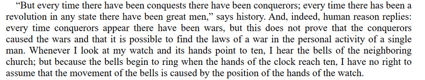 When we look at a moment in history, Tolstoy says, it’s like looking at a moment in the race between Achilles and the tortoise. Not only is it unfair to the real people who had to deal with the complete flow of events rather than a dubious snapshot of perhaps a misleading moment, but it lures us into illogical and absurd conclusions: