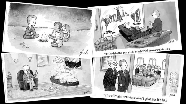 Think climate change isn’t funny? Try telling that to cartoonist Tom Toro. The frequent New Yorker contributor, who also writes and draws a comic strip called Home Free,” [link added] often points his pen at the pain and hypocrisy behind the climate crisis and other environmental issues, with blistering results.