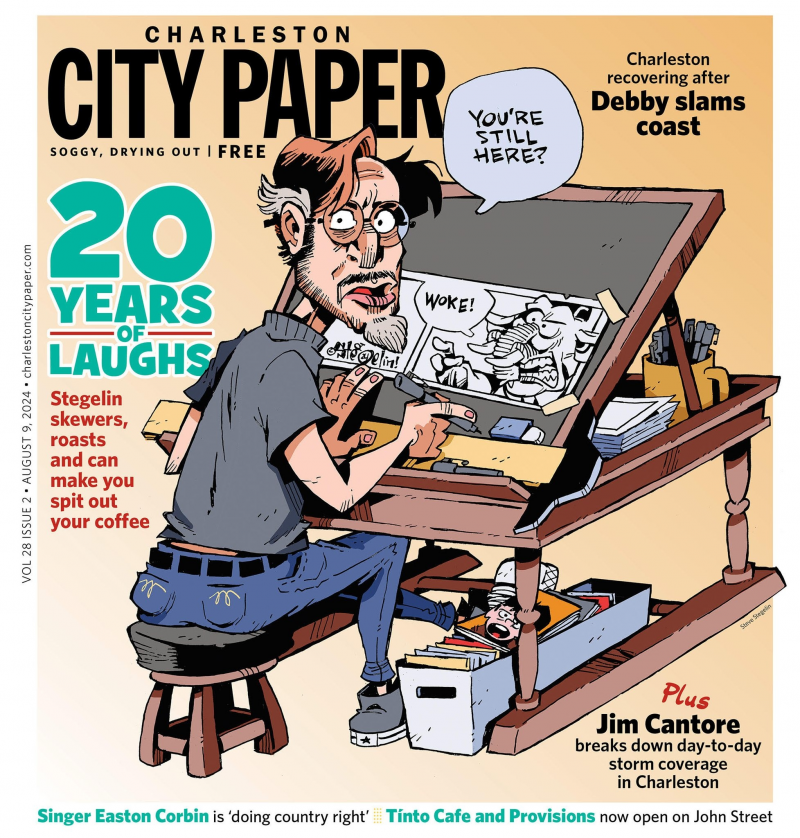 The Charleston City Paper cover features Steve Stegelin, their editorial cartoonist for the past 20 years.