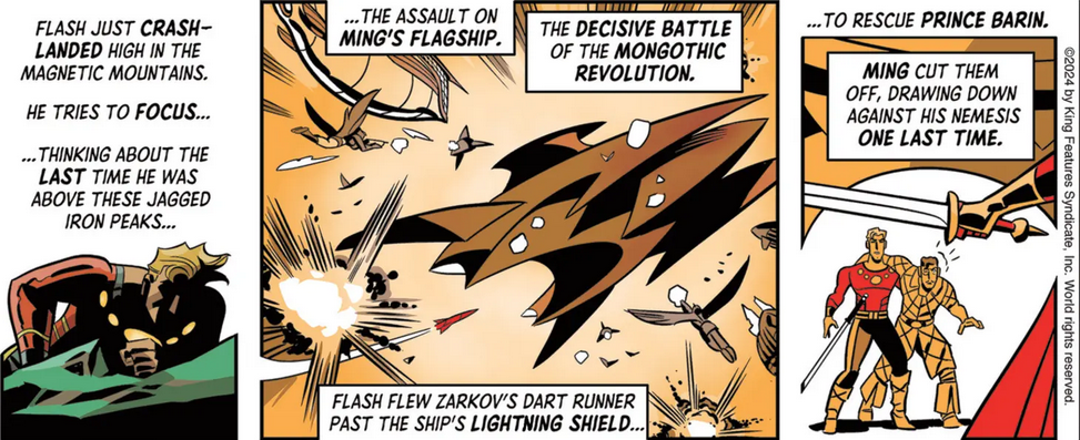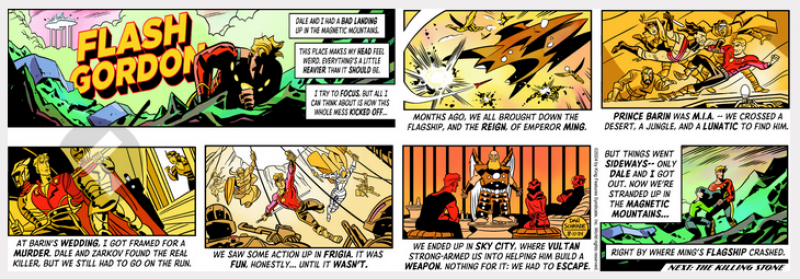 The problem, I think, is that the Sunday page is a recap of the previous week’s action, but the previous week was a summary of The New Adventures of Flash Gordon up to this point. So the Sunday was a condensation of a synopsis.