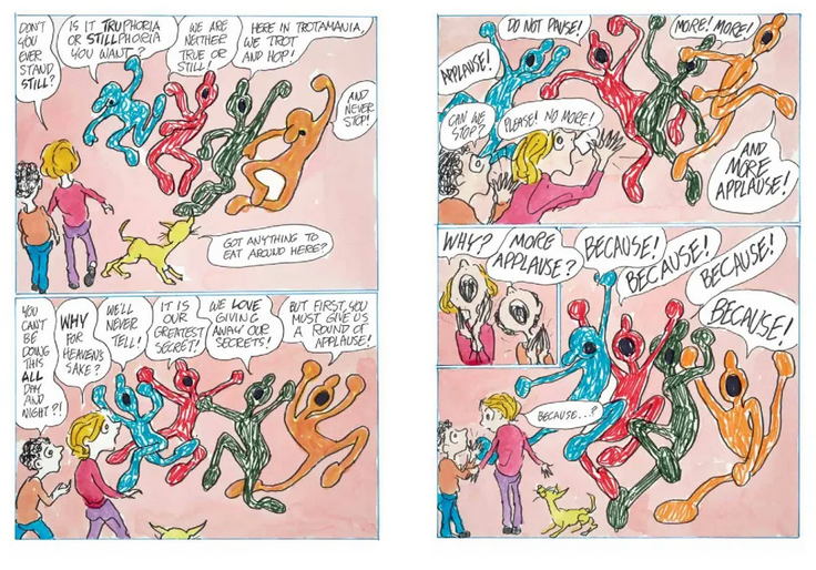 The surreal worlds the kids travel through make little sense at first and then when you start to realize the unreal reality of the situation Feiffer shifts gears. But there is a story and the genius of Jules keeps us captivated by all that is happening. And, somehow, when the denouement comes it all makes sense, a satisfying and enjoyable story. The weirdness and, of course, the art all become part of the charm.