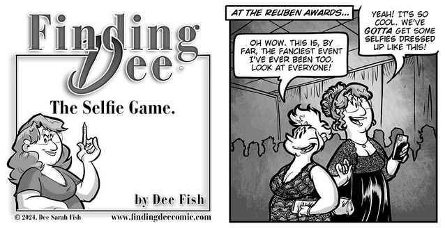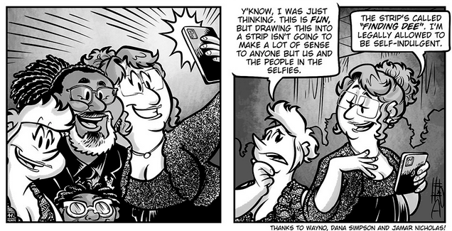 A recent installment of Dee Fish’s autobiographical comic Finding Dee (a Silver Reuben nominee) featured fellow cartoonists Dana Simpson, Jamar Nicholas, and yours truly. Dee is a terrific cartoonist, and her inking skills are spectacular. I particularly like the way she incorporated each person’s comics into their panel. Very nice job on the Secret Symbols, Dee!