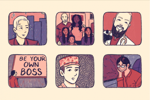 Shifts (An illustrated history of the future of work) by Beatrix Lockwood and Maya Scarpa has ended its twice weekly, limited run in The Washington Post with its eighth installment (August 26 – September 18, 2024).