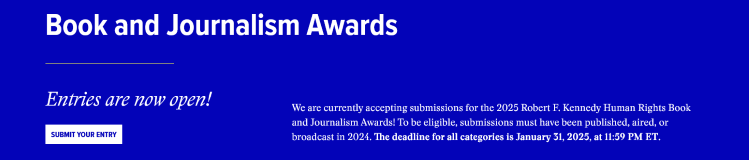 We are currently accepting submissions for the 2025 Robert F. Kennedy Human Rights Book and Journalism Awards! To be eligible, submissions must have been published, aired, or broadcast in 2024. The deadline for all categories is January 31, 2025, at 11:59 PM ET.
