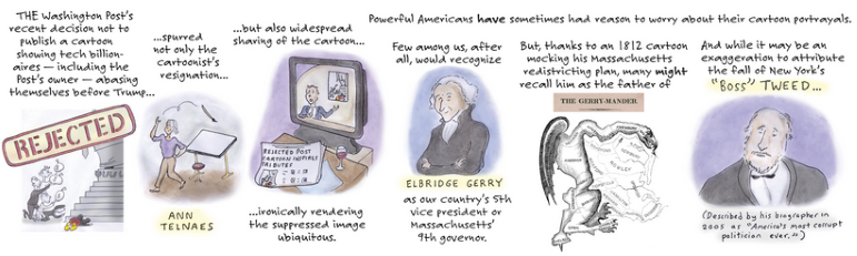 [Ann Telnaes] wrote … I doubt my decision will cause much of a stir and that it will be dismissed because I’m just a cartoonist. But I will not stop holding truth to power through my cartooning, because as they say, ‘Democracy dies in darkness’”.