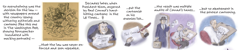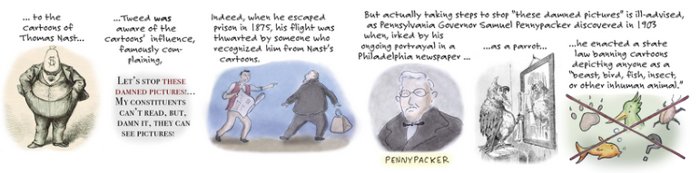 According to the First Amendment Museum, around 1950 “newspaper advertisers and publishers began exerting more of an influence over political cartoons.” And as digital media increased a cartoon’s reach and lifespan (if not its artist’s salary), persecution became a vivid threat.