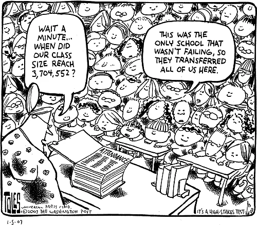 Kelley gets it right that one-third of eighth grade students are reading below the benchmarks, though he uses a cartoonist’s privilege to exaggerate by suggesting that the underperforming third are totally illiterate. Bok, however, treads on reality in ways that seem more hostile than insightful.