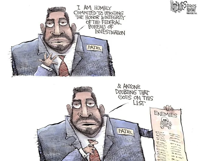 Nixon’s list was personal and private and if John Dean hadn’t mentioned it in testimony, we might well never have dug it out and examined it. By contrast, Patel put his list in a book for everyone to see, and we’re also hearing Dear Leader’s people openly talk about jailing disloyal reporters and other troublemakers.