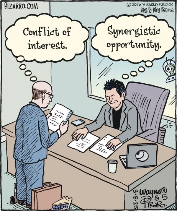 To be clear, there’s all sorts of privatization going on in the government, and I’d welcome an investigation into the conflicts of interest whereby President Musk snatched a contract away from Verizon and awarded it to himself, plus all the rocketry profiteering going on with him and with Trump acolyte and contributor Jeff Bezos.