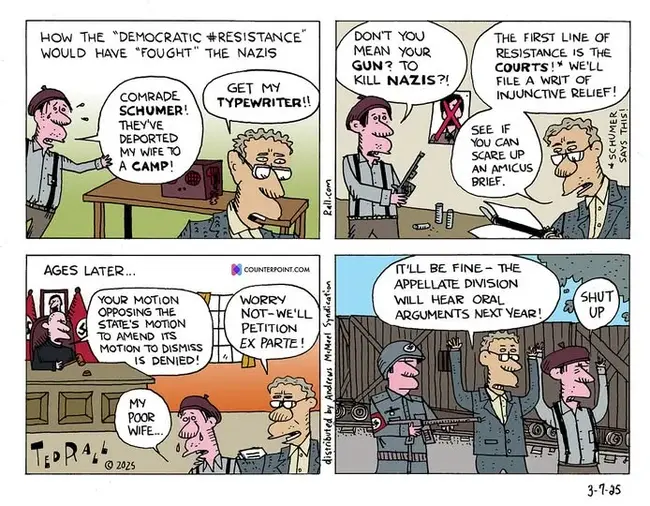 In fact, speaking of Nazis deporting people, I just read that a judge has halted Trump’s plan to declare anyone who opposes American policies to be a terrorist fit for deportation, though there’s no word yet on legal resistance to his war on invading cartoonists.