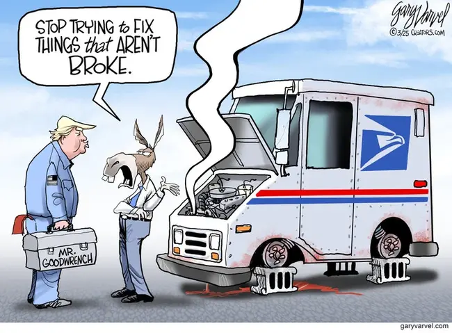It’s unusual to see Varvel and Campbell apparently on the same side, but I’m flummoxed over the notion that something’s wrong with the USPS, beyond, of course, the sabotage of having forced them to bank their pension funding ahead of time, which happened over a decade ago under Barack Obama. (UPDATE: But see comments)
