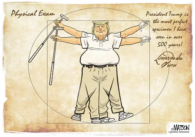 Matson compares him to Leonardo’s Vitruvian Man, drawn as an example of the perfect human body, and while Leonardo didn’t actually write the statement here, it’s not much more enthusiastic and flattering than what Trump’s doctor wrote.