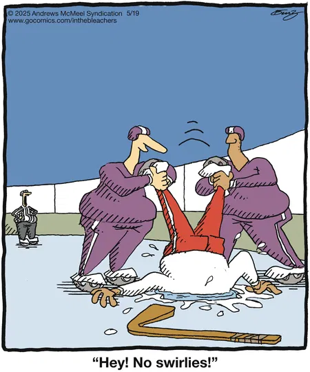 As for the “In the Bleachers” gag, it, along with gags about people ice fishing on hockey rinks, requires forgetting that hockey rinks are built on concrete, not over bodies of water.