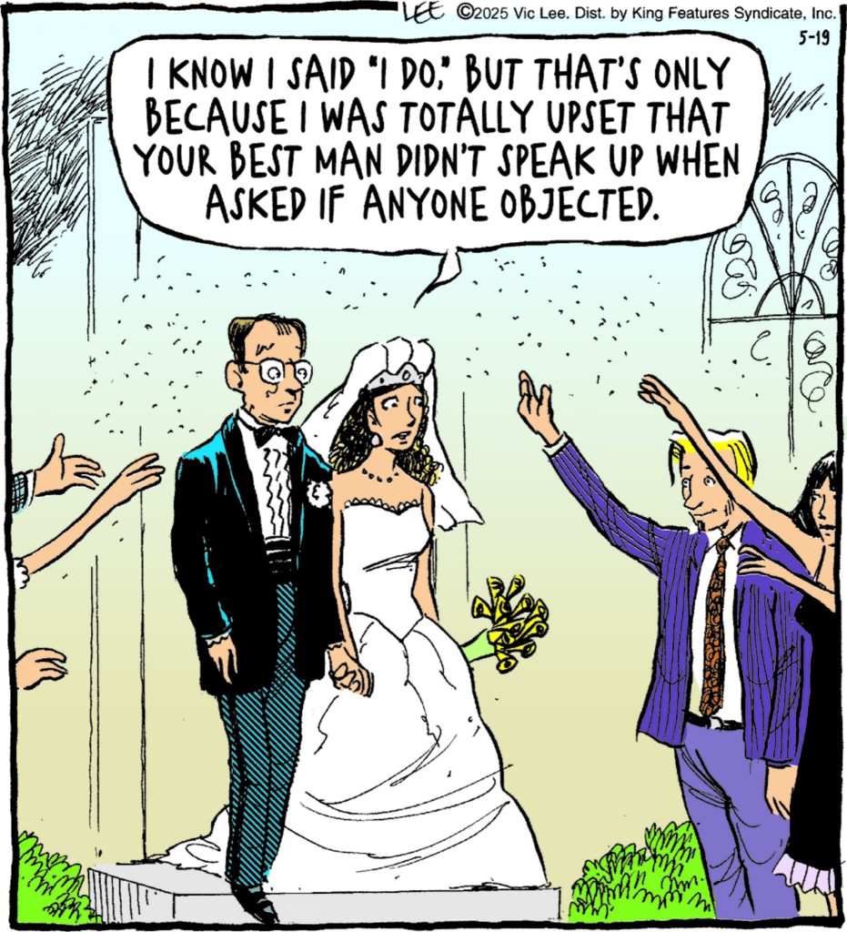The phrase in the wedding ceremony is “Should anyone present know of any reason that this couple should not be joined in holy matrimony, speak now or forever hold your peace” but it’s not an invitation for Benjamin Braddock to scream “Elaine!”