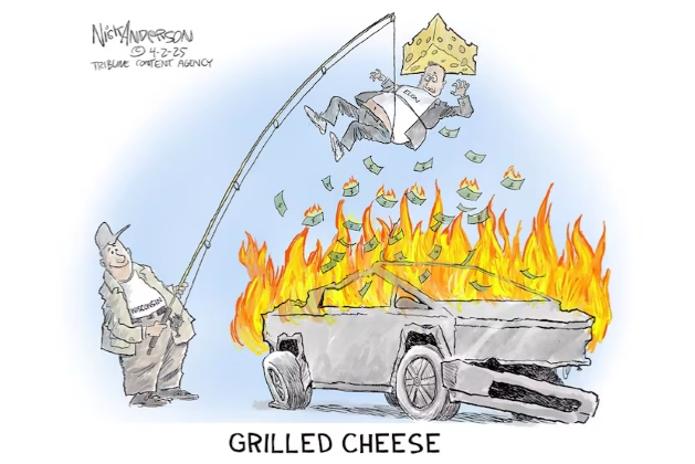 Occasionally, a cartoon goes too far. That was the case back in early April, when one depicted Elon Musk suspended over a burning Tesla, and readers rightly expressed their ire. “The minute I got the first note from a reader that day, I knew they were right, and we were wrong,” Bush told me. “I felt terrible about it.”