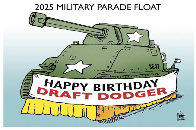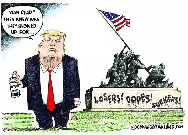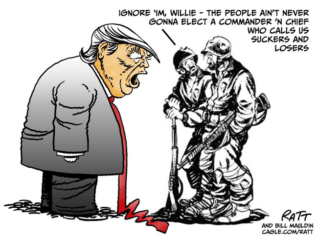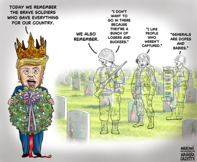 On the other hand, however you feel about what people did half a century ago, more recent actions and statements matter, and cartoonists need only quote the president accurately to make his attitude about the military clear. These aren’t things he said as a dumbass college kid but statements he made while he was Commander in Chief.