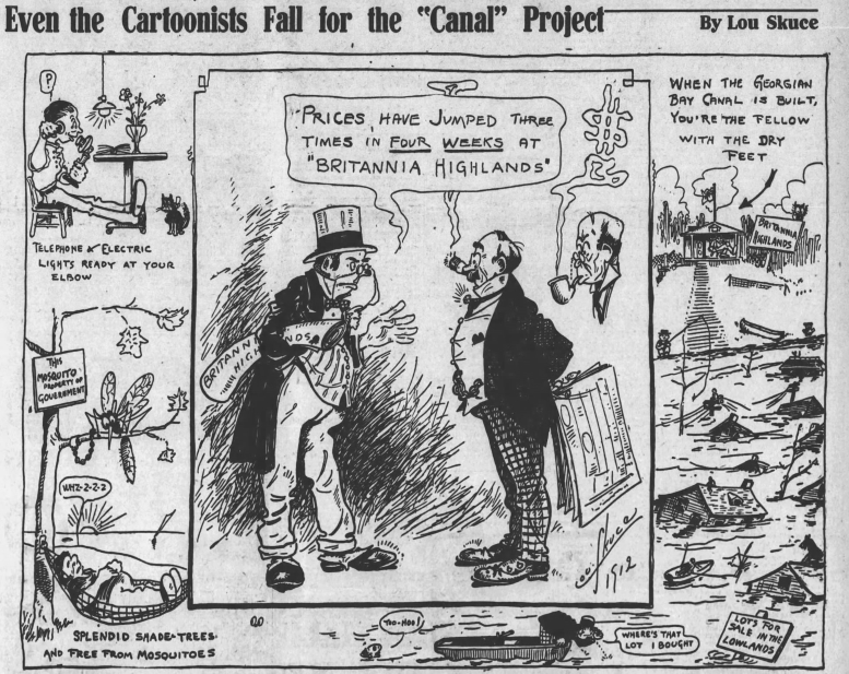 1. Huh. From this post, I just learned about the proposed Georgian Bay ship canal after seeing it top right in the early Lou Skuce panel. A local Ontario megaproject, long proposed and wrangled over, that never happened, to make a shipping route that shortcut the St Lawrence – Lake Ontario- Welland Canal – Lake Erie route. A canal system that would have followed the old aboriginal & voyageur routes.